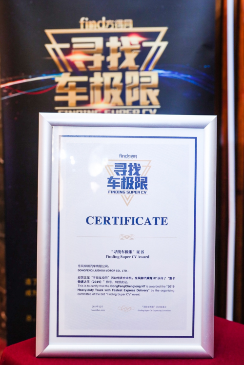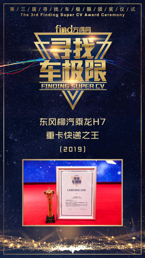 2019年12月10日,由方得网主办的第三届“寻找车极限”活动发布会在北京顺利召开,东风柳汽旗下明星车型乘龙H7荣膺“2019重卡快递之王”大奖。